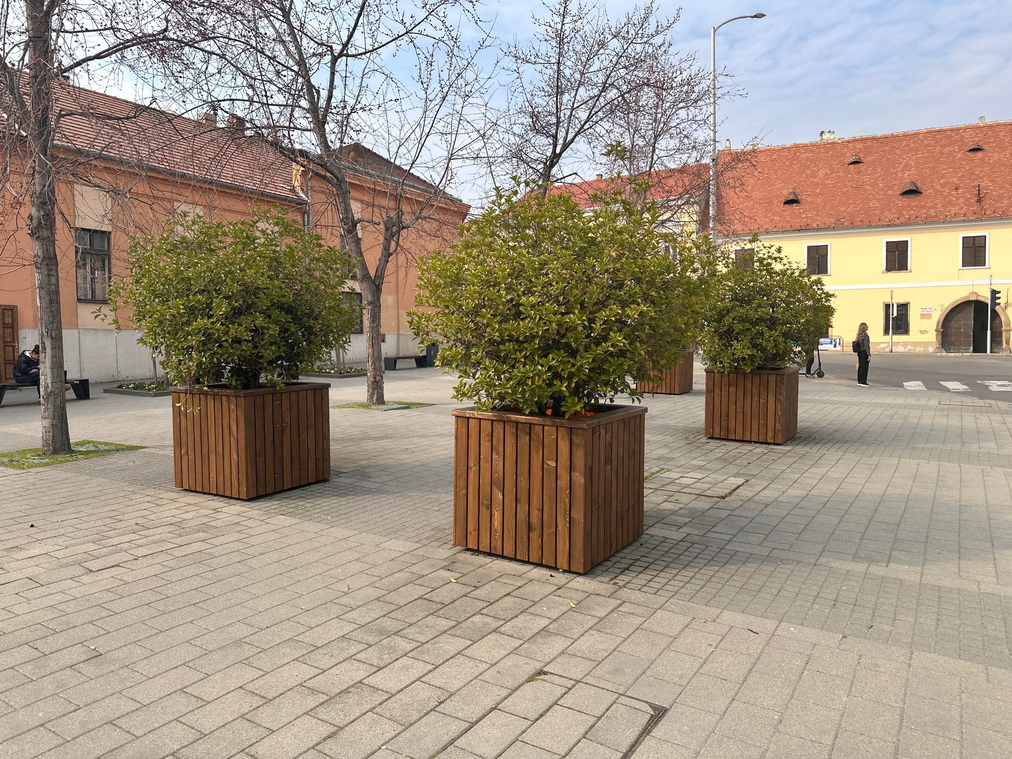 A Kórház téren és a Ferencesek utcájában található dézsás növények tartószerkezete az évek során elhasználódott, ezért munkatársaink új, esztétikus faburkolattal látták el a növényládákat. A megújult elemek nemcsak tartósabbak, hanem a tér megjelenéséhez is jobban illeszkednek.