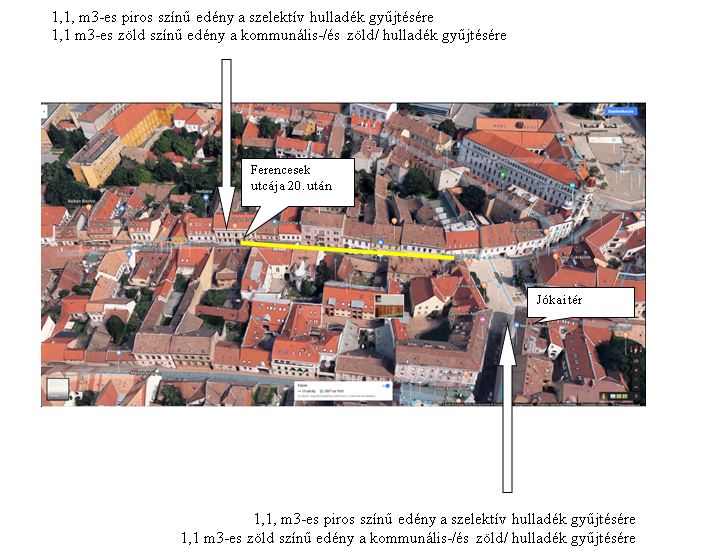 A gyűjtőpontok a Ferencesek utcája gépjárművel járható részén, illetve a Jókai utca felső végén kerülnek kialakításra. Kérjük, hogy az ingatlanában keletkező kommunális és szelektív hulladékokat a gyűjtőpontok edényeiben, vagy a megszokott hulladékszállítási napokon ingatlanjaik elé zsákban szíveskedjenek kihelyezni.