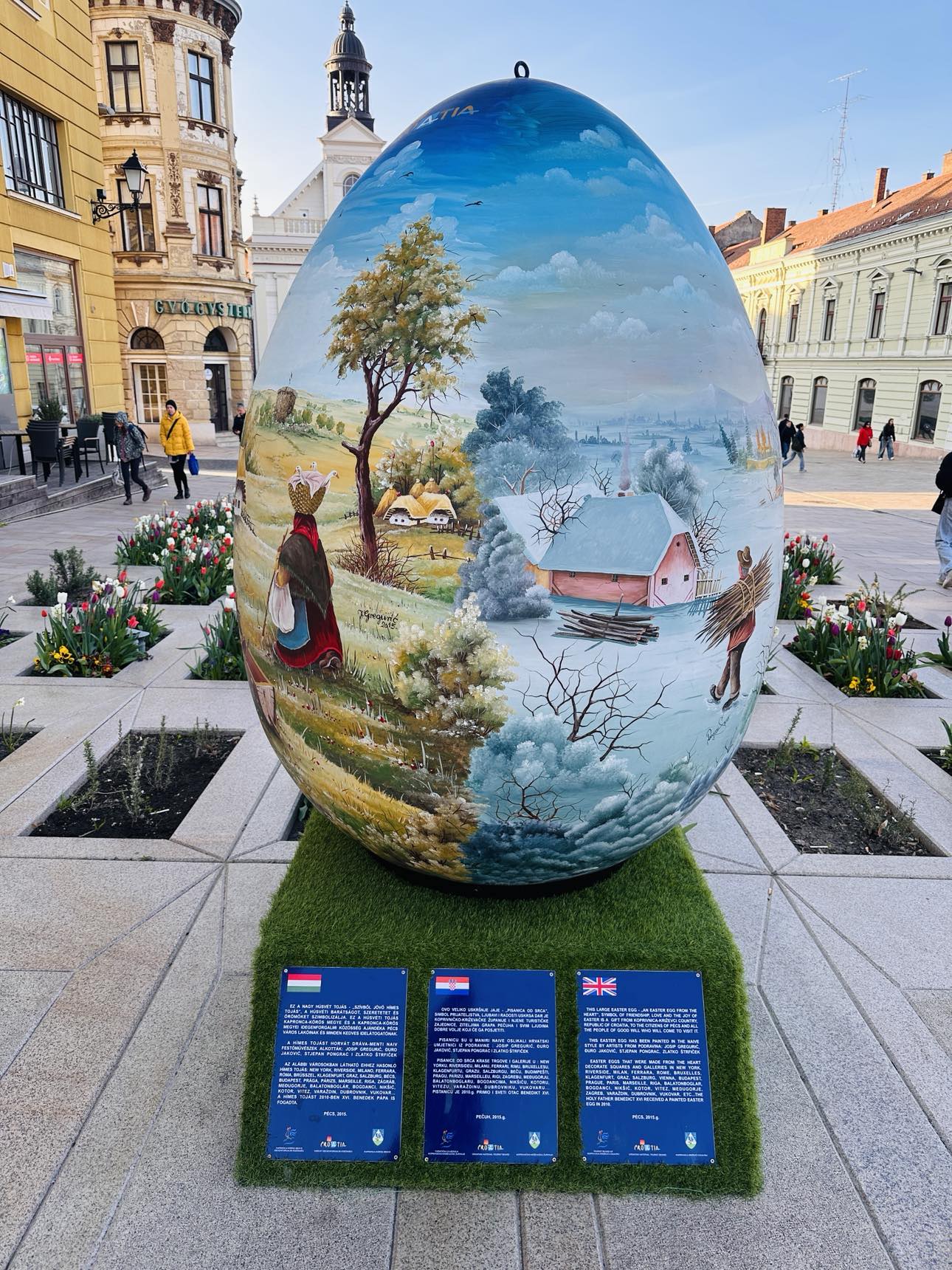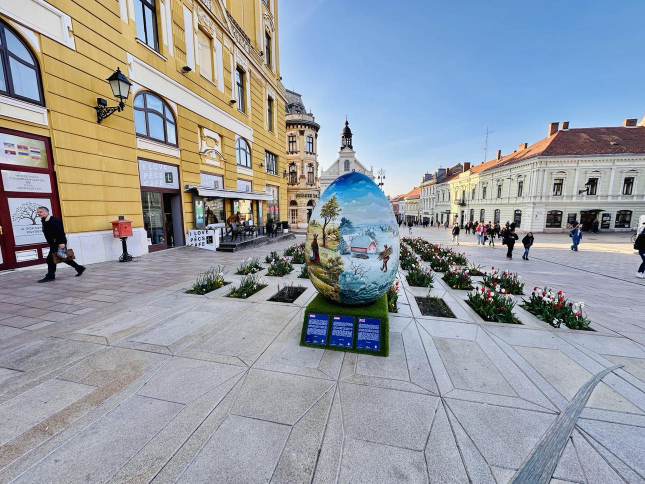 A különleges alkotást még 2015-ben a horvátországi Kapronca-Körös megyei idegenforgalmi közösség ajándékozta Pécs lakóinak és minden kedves városunkba látogatónak. A hímes tojást Dráva-menti festőművészek, Josip Greguric, Duro Jakovic, Stjepan Pongrac és Zlatko Strficek alkották. A szimbolikus dísz az ünnep legfontosabb értékeire emlékezetet: a barátságra, a szeretetre és az örömre.