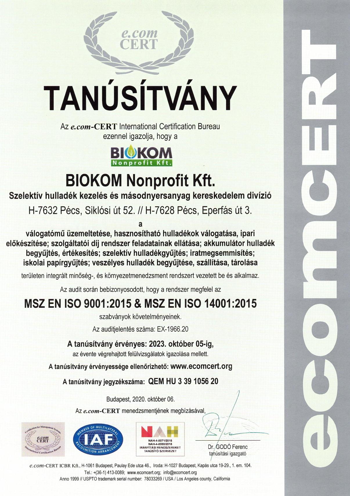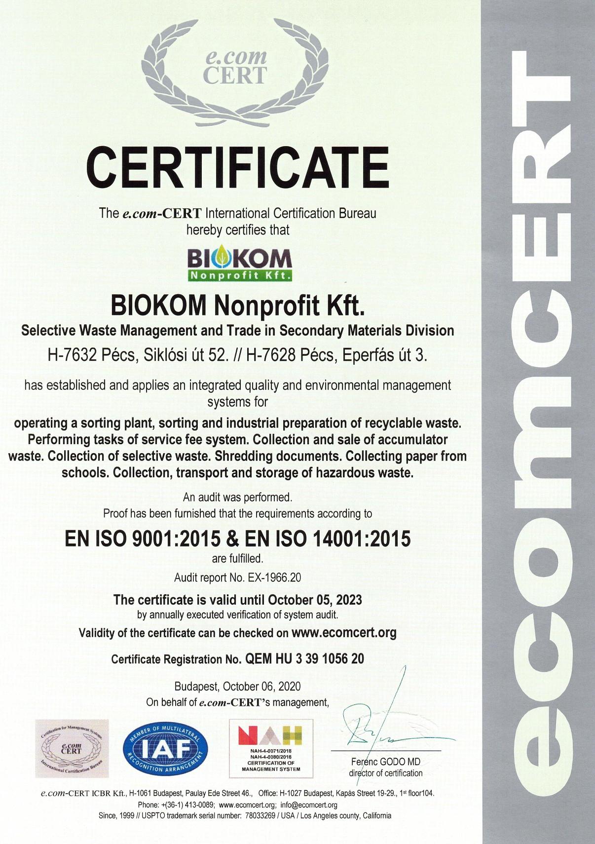 Jelenleg a BIOKOM Nonprofit Kft. szelektív hulladékkezelési és másodnyersanyag kereskedelmi divíziója az alábbi területeken rendelkezik MSZ EN ISO 9001:2015 és MSZ EN ISO 14001:2015 szabványok követelményeinek megfelelő, tanúsított integrált minőség és környezetmenedzsment rendszerrel.