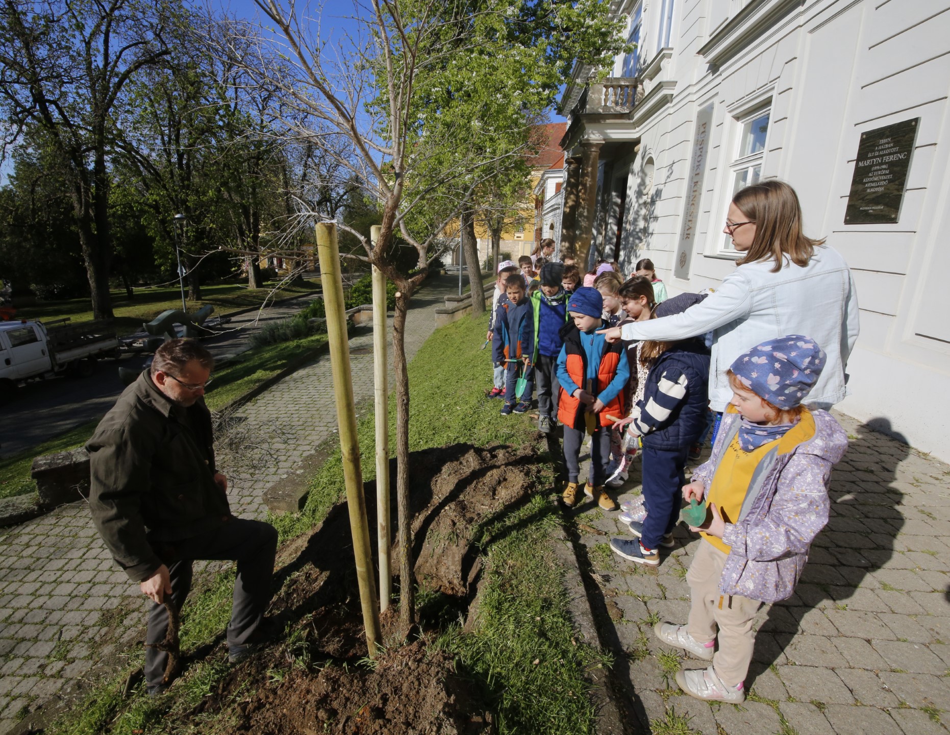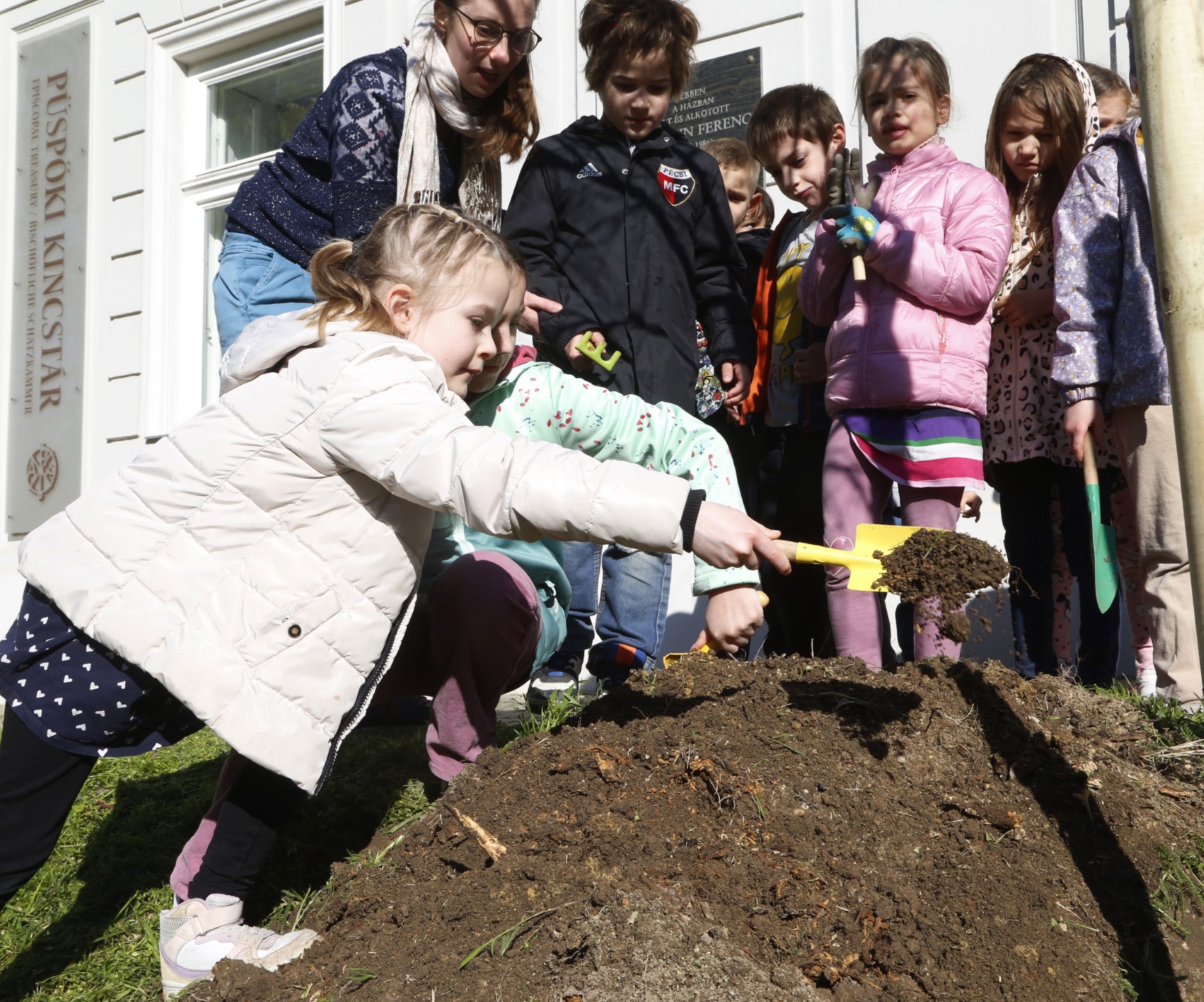 Apró ásókkal felszerelkezve, lelkesen indultak a gyerekek a pénteki faültetésre. A városüzemeltetési társaság már előkészítette nekik a terepet, a facsemetéket csak be kellett borítani földdel, majd bőségesen meglocsolni. A két osztály összesen 17 fa ültetésében segédkezett – 10 gesztenyefa a Szent István téren, 7 pusztaszil pedig a Káptalan utcában kapott helyet.
