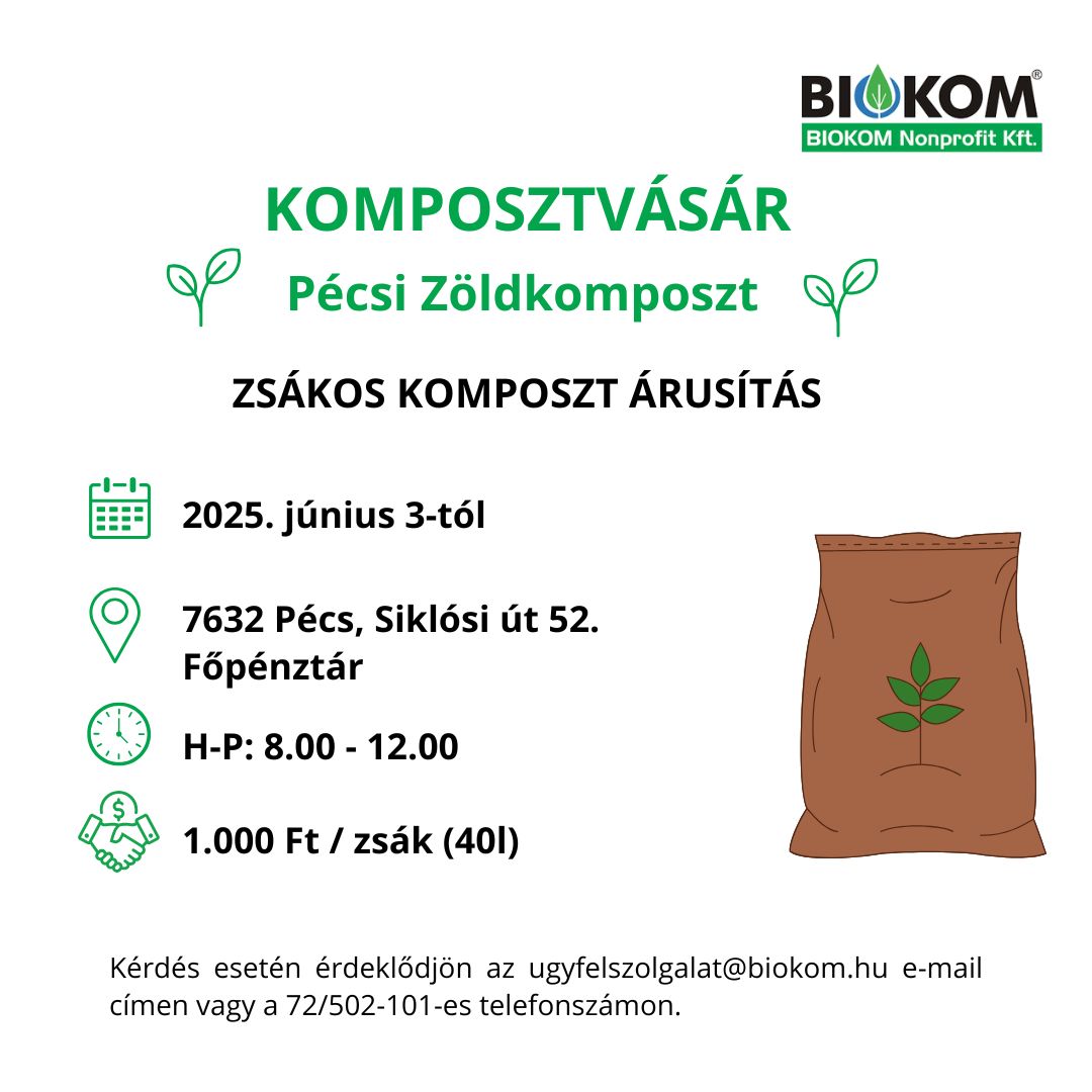 Társaságunk lakossági kezdeményezésre megkezdi a Pécsi Zöldkomposzt árusítását a héten. A kiváló minőségű, a pécsiek zöldhulladékából a kökényi hulladékkezelő központban előállított komposztot „lakossági kiszerelésben”, 40 literes zsákokban kínáljuk kifejezetten a városlakók számára, Pécsett, a Siklósi út 52. szám alatti központi irodaépületünkben.