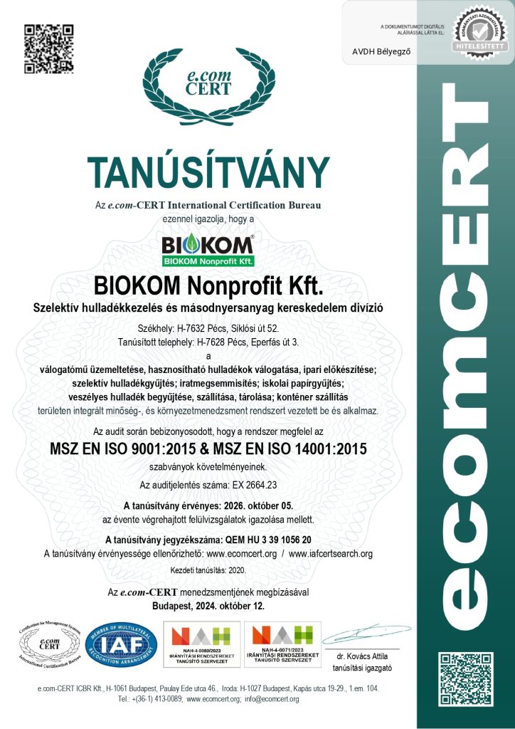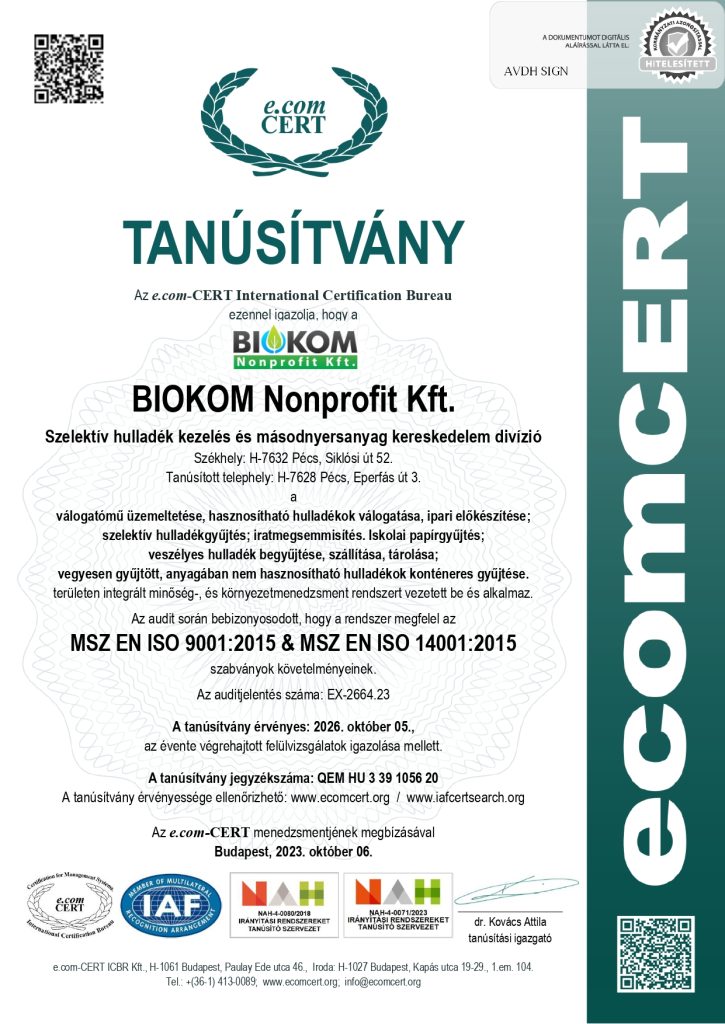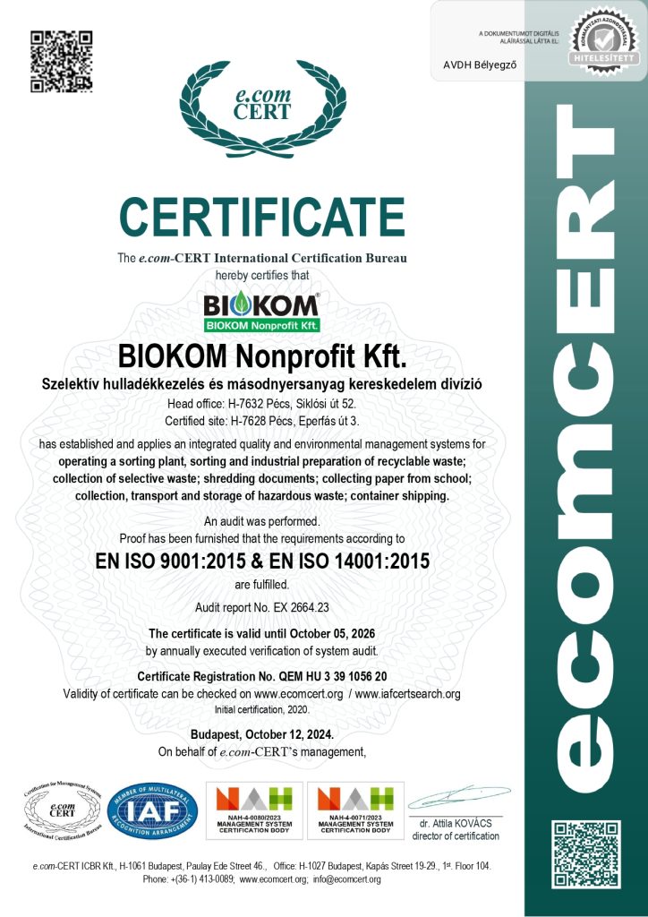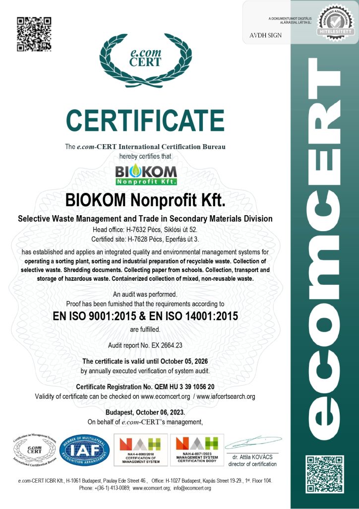 Jelenleg a BIOKOM Nonprofit Kft. szelektív hulladékkezelési és másodnyersanyag kereskedelmi divíziója az alábbi területeken rendelkezik MSZ EN ISO 9001:2015 és MSZ EN ISO 14001:2015 szabványok követelményeinek megfelelő, tanúsított integrált minőség és környezetmenedzsment rendszerrel.